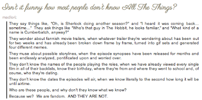 "They say things like, 'Oh is Sherlock doing another season?' and 'I heard it was coming back...sometime...' They ask things like 'Who's that guy in The Hobbit, he looks familiar...' and 'What kind of a name is Cumberbatch, anyway?'